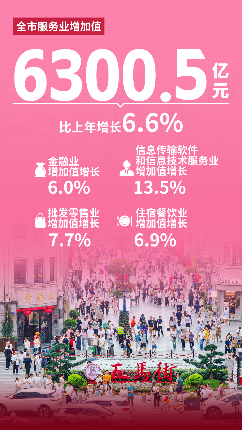 2025年,全市服务业增加值6300.5亿元,比上年增长6.6%。分行业看,信息传输软件和信息技术服务业、金融业等现代服务业能级持续提升,分别比上年增长13.5%、6.0%;生活性服务业需求有效释放,批发零售业、住宿餐饮业增加值分别比上年增长7.7%、6.9%。服务业生产经营质效持续好转,1—11月份,全市规上服务业企业营业收入比上年增长10.8%,其中规上生态保护及环境治理业、数字经济核心产业服务业营业收入分别比上年增长13.3%、16.9%。