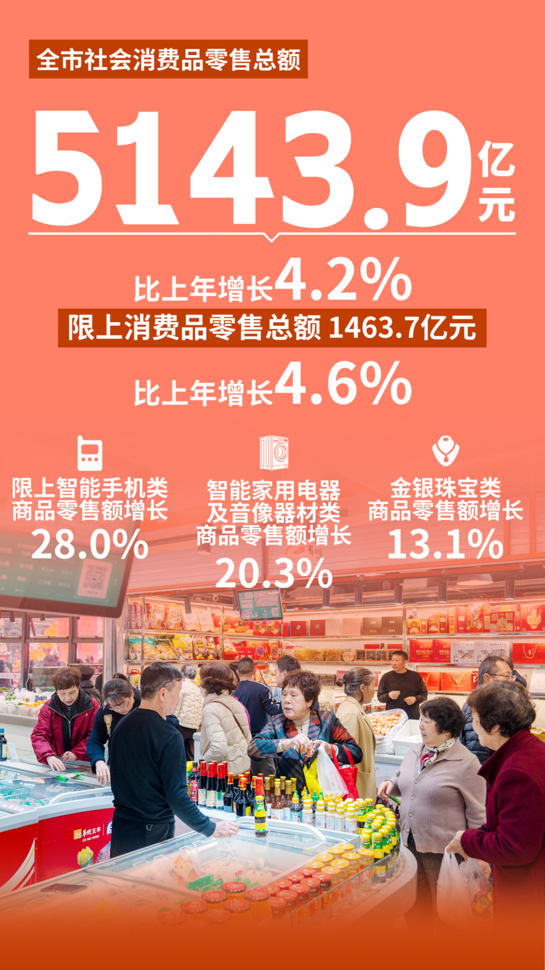 2025年,全市社会消费品零售总额突破5000亿元,达5143.9亿元,比上年增长4.2%;其中限上消费品零售总额1463.7亿元,比上年增长4.6%。“以旧换新”政策持续发力见效,消费智能化、品质化稳步提速,全市限上智能手机类、智能家用电器及音像器材类、金银珠宝类商品零售额比上年分别增长28.0%、20.3%、13.1%。网上零售增势良好,限上批零企业通过公共网络实现商品零售额比上年增长20.8%。“赛事+”“演艺+”等文体旅融合发展加速催生消费新活力,带动限上住宿业、餐饮业营业额比上年分别增长7.7%、14.1%。