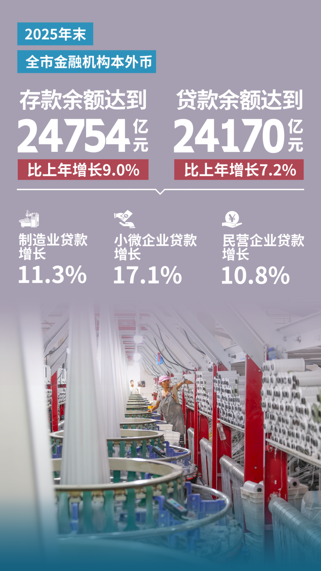 2025年末,全市金融机构本外币存、贷款余额分别达到24754亿元、24170亿元,比上年增长9.0%、7.2%。金融服务实体经济加码加力,制造业贷款比上年增长11.3%;普惠金融扩面提质,小微企业贷款、民营企业贷款分别比上年增长17.1%、10.8%。市场主体量质齐升,全年新设企业数6.3万户,年末全市市场经营主体161.1万户。物流人流高效畅通,交通枢纽能级跃升,公路运输总周转量比上年增长8.7%;温州港货物吞吐量10086万吨,比上年增长11.8%,正式跨入“亿吨大港”;机场旅客吞吐量1305.9万人次,比上年增长4.2%。快递业再攀新高,快递业务量累计完成26.8亿件,比上年增长5.7%。