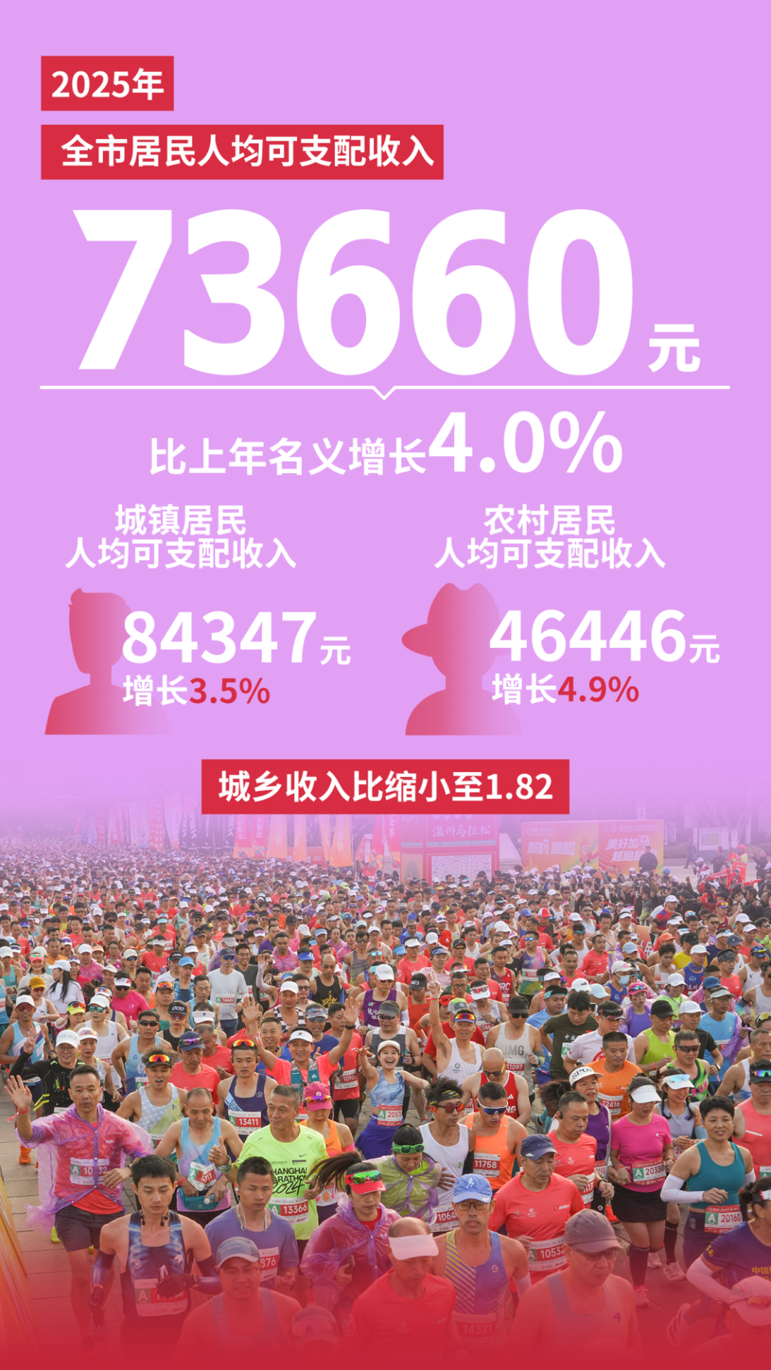 2025年,全市居民人均可支配收入73660元,比上年名义增长4.0%。按常住地分,城镇居民人均可支配收入84347元,比上年增长3.5%;农村居民人均可支配收入46446元,比上年增长4.9%。城乡协调加速推进,城乡收入比由上年的1.84缩小至1.82。“提低”步伐稳中有进,全市低收入农户人均可支配收入23815元,比上年增长11.0%。民生实事扎实推进,全年民生支出占一般公共预算支出比重79.2%。