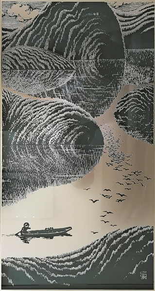 玻璃银光刻源自龙湾永强地区,工序繁复,需历经画稿、涂蜡、刻线、镀银等多道步骤,曾广泛装点于旧时民居的家具与厅堂。项之华的《绿水青山》正是以此传统技艺为基石创作的。作品以玻璃为纸,银光为墨,通过绿色衬底与银白线条的巧妙勾勒,再现了层峦叠翠、碧水长流的画卷。他在创作中融入了现代版画与钢笔画的语言,使画面简洁而富深意,既保留了传统手工艺的质朴神韵,又焕发出清新的时代气息,诠释了“人与自然和谐共生”的主题。