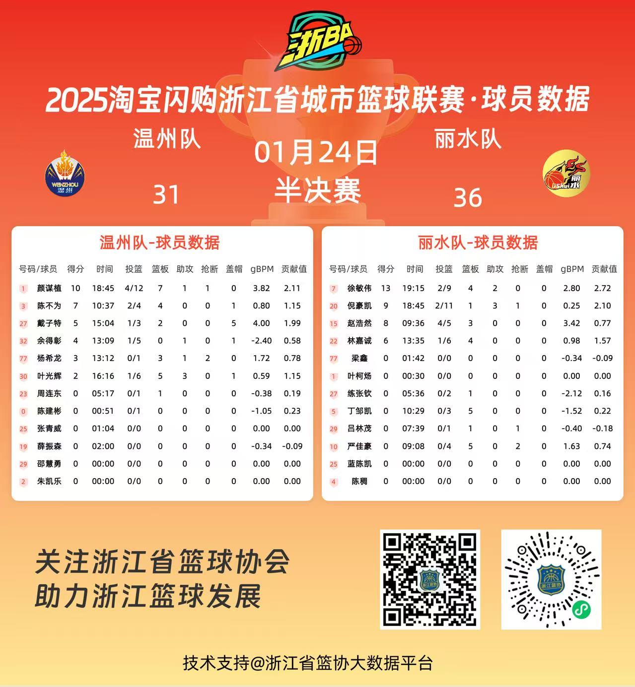 加时赛,丽水队连得6分开局,其中倪豪凯连得4分,好在叶光辉命中关键三分球,把比分追成77∶80。徐敏伟上篮,余得彰送上“大火锅”,不过这次冲击内线上篮落地时,徐敏伟左腿受伤被担架抬下场。温州队防住倪豪凯的三分球远投不中,下一回合,叶光辉三分球远投,赵浩然犯规,叶光辉三罚两中,79∶80,只差一分,加时赛还剩2分03秒。关键时刻,两队均连续出现失误。叶光辉五次犯规下场,赵浩然两罚一中,79∶81,倪豪凯上篮得分,79∶83。最后22秒,丽水队27号练张钦两罚不中,朱凯乐抢到后场篮板球,温州队赶紧暂停。虽然余得彰得到2分,比分变为81比83,颜谋植被迫战术犯规,他也五犯离场。赵浩然两罚命中,随着陈建彬三分球不中,81∶85,温州队以总比分1∶2不敌丽水队,无缘决赛。这样,丽水队与杭州队会师决赛,争夺最后的冠军。