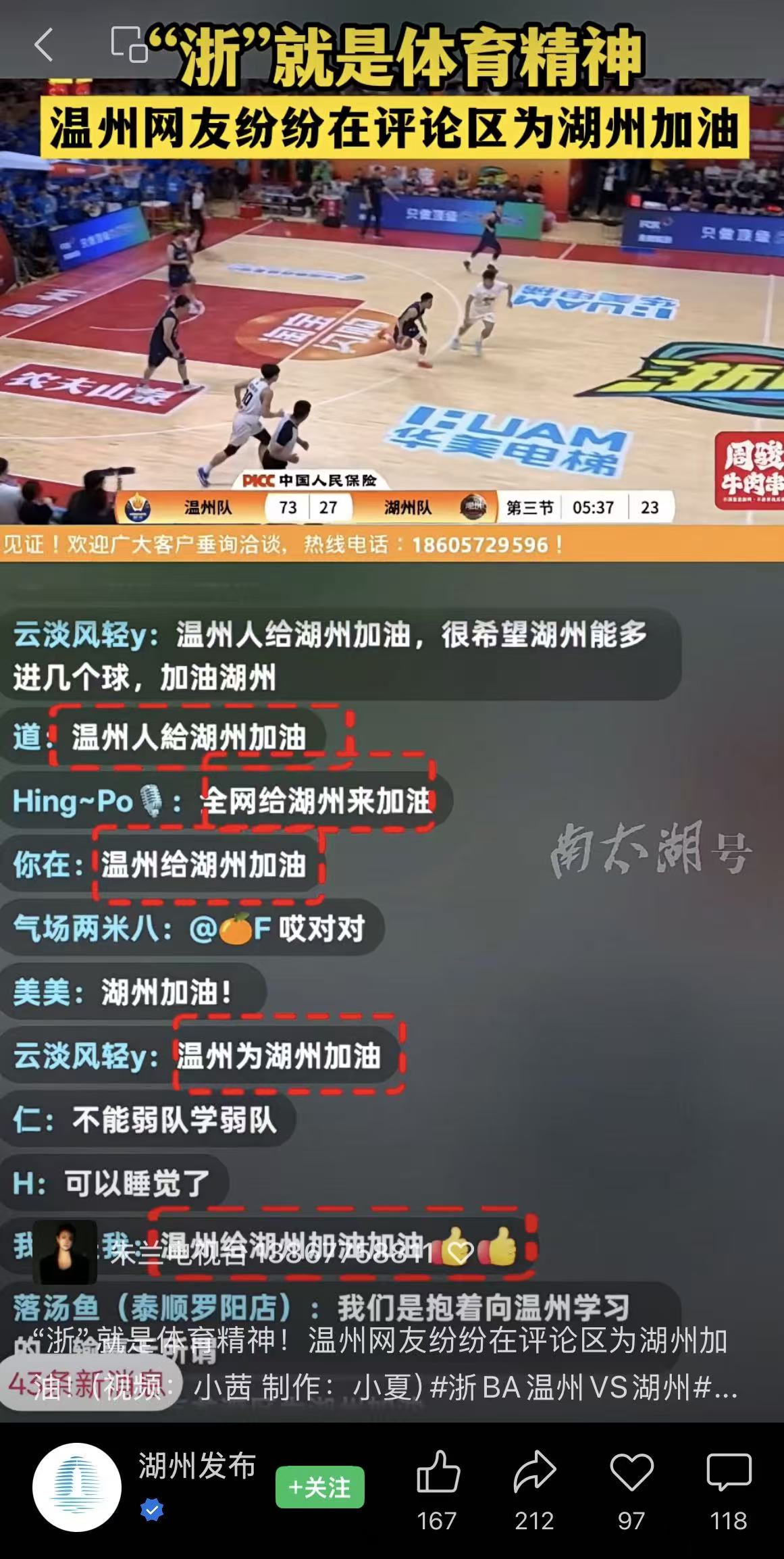 去年10月21日晚,温州队主场以102∶52大胜湖州队,最后一节,比赛已失去悬念,温州体育中心体育馆里,从现场主持人到温州啦啦队,再到其他温州球迷,都在不遗余力地高喊“湖州加油”。不仅如此,在各大平台的直播间里,温州网友纷纷打出字幕隔着屏幕为湖州队加油:“温州人给湖州加油”“龙湾人给湖州加油”,而湖州队的球员也拼到了最后一刻,并没有因为分差巨大而放弃。网友表示,“浙BA一家人”“温州真温暖”“评论区一片和谐”“这才是浙BA的意义,这才是体育精神。”