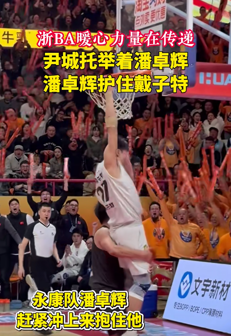 在今年1月13日的八强淘汰赛首场比赛中,温州队在主场以87∶61毫无悬念地战胜永康队,赢得淘汰赛开门红。第二节,叶光辉助攻篮下的戴子特,戴子特上演双手暴扣得分,引爆全场。就在戴子特落地时,回防篮下的永康队球员潘卓辉用手护住戴子特,以防摔倒受伤,潘卓辉主动保护戴子特的温暖一幕让人感动。原来就在几天前,苍南队与永康队的比赛中,潘卓辉在防守时摔倒在地,落地瞬间,他被苍南队球员尹城伸手托了一下,正是这个托举动作,让潘卓辉减少了受伤的可能。而潘卓辉保护戴子特的爱心传递,同样获得众多球迷点赞。