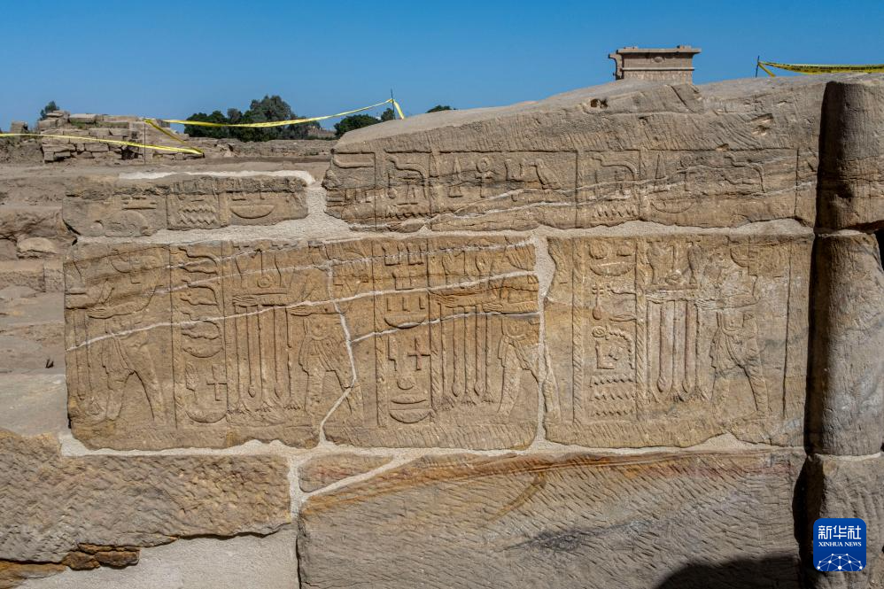 中埃卢克索孟图神庙联合考古队24日宣布,在埃及卢克索省卡尔纳克孟图神庙遗址区成功清理出一座此前未知的圣湖建筑遗迹。图为这是1月24日在埃及卢克索省卡尔纳克孟图神庙遗址区拍摄的刻有浮雕的石块。新华社记者 辛梦晨 摄
