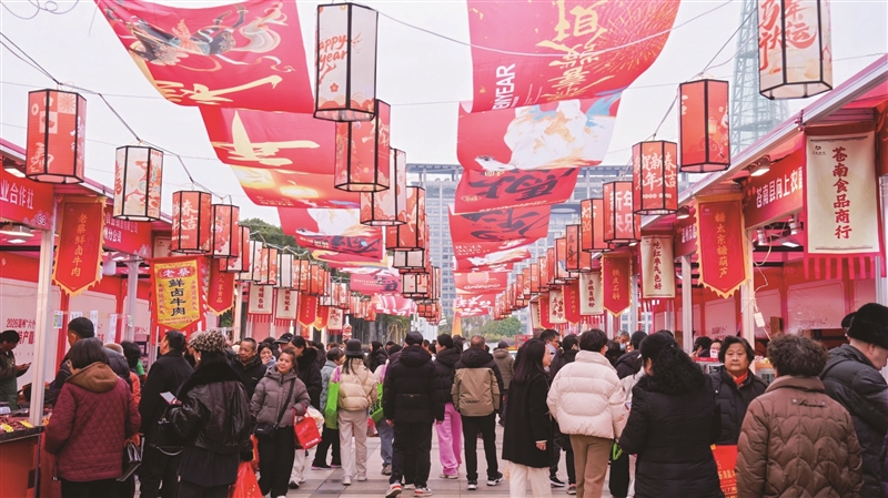 温州网讯 由市农业农村局主办的2026温州“六个一”土特产嘉年华正在温州科技广场火热进行中,将持续至1月27日。此次展销规模超1万平方米,共邀温州市内外400多家展商,精选各地尖货超3000种,设有品牌特装展区、土特产销售区、农家小吃区、观赛区、茶叶一条街、围炉煮茶休闲区等六大板块,让消费者一站式购尽各地土特精品和年货好礼。图为昨天嘉年华现场人潮涌动的热闹场景。