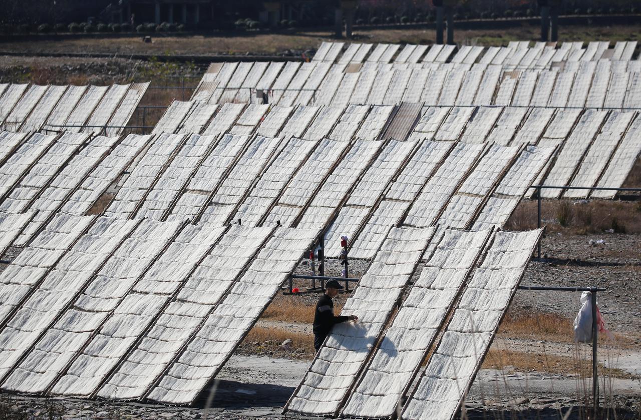 “前山后山,中间一块沙石滩,人多田少日夜做粉干”。冬日的平阳五十丈村,溪畔石滩是“天然晾晒场”。放眼望去,上千张铺满细粉干的竹篾整齐排列,在溪滩畔熠熠生辉。