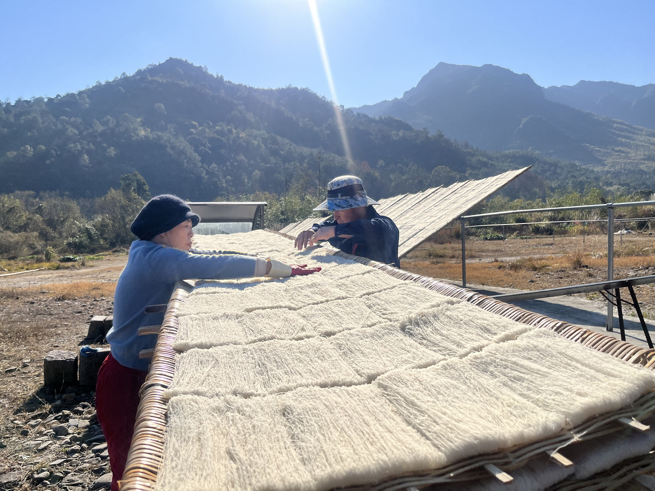 “趁这两天天气好,把年前这批粉干晒出来。现在不同以往了,五十丈粉干名气越来越大,销路不愁,收入也比较稳定。” 吴大嫂边整理着竹篾边回忆,以前交通不便,粉干都是靠扁担挑出去卖,如今,专程开车来买的也不少。吴大嫂家粉干制作的手艺可追溯至其太爷爷辈,她从十几岁就开始接触这门技艺。此时,她已和丈夫从昨日傍晚连夜忙活至上午10点多, 村里还有近百户人家正在经历相似的忙碌。