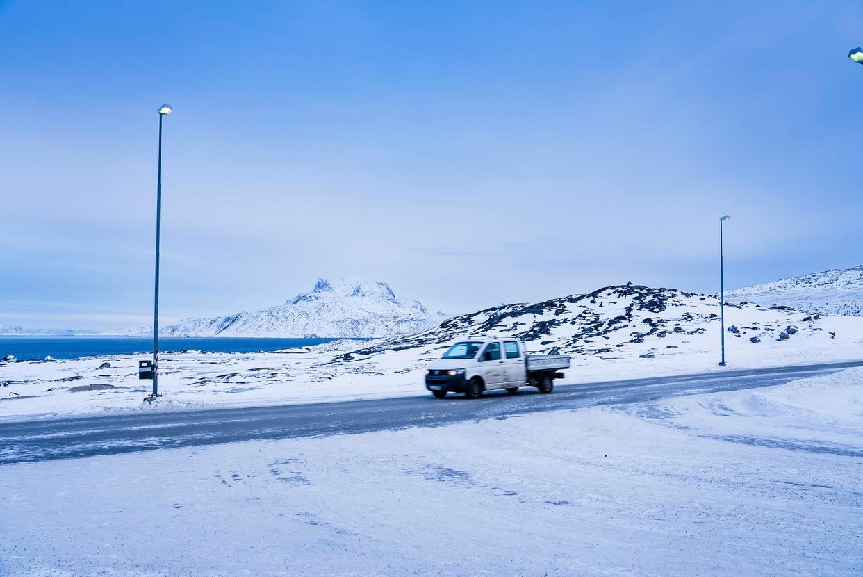 1月16日,一辆汽车行驶在丹麦自治领地格陵兰岛首府努克市郊。新华社发(安德斯·孔斯豪格摄)