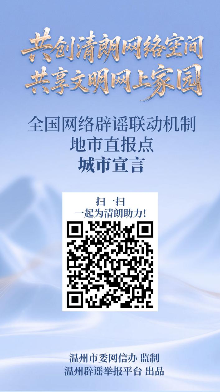温州网讯 1月26日下午,以“深化辟谣联动 共建清朗网络”为主题的全国网络辟谣联动机制直报点建设现场推进会在浙江温州举办。会上,全国网络辟谣联动机制直报点共同发出《“共创清朗网络空间·共享文明网上家园”城市宣言》,号召社会各界坚守理性,做真实信息的守护者;主动作为,做谣言治理的行动者;凝聚合力,做清朗空间的共建者;弘扬新风,做网络文明的践行者,合力开拓更加健康、向上、美好的网络时代新未来。