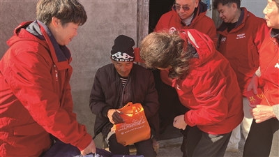 义工为老人送上棉被等御寒物资。潘培期 摄