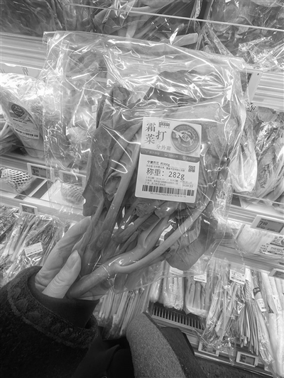 在盒马鲜生超市,霜打菜还设有专区,贴上了独特的“霜打菜 有点甜”身份标识,有小白菜、长白萝卜等多个品种。