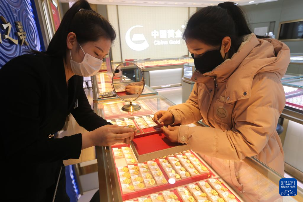 1月26日,市民在江苏省连云港市连云区一家黄金店挑选黄金饰品。新华社发(王春 摄)