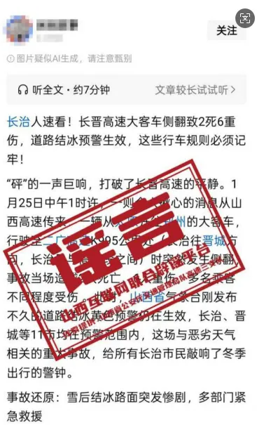 近日,网上出现“长治人速看!长晋高速大客车侧翻致2死6重伤,道路结冰预警生效,这些行车规则必须记牢!”等相关图文信息,引发广泛关注,山西省公安厅交通管理总队高速三支队立即组织调查核实。经核实,相关网传内容所指路段并未发生交通事故。网传内容关于“事故当场造成2人死亡、6人重伤,多名乘客不同程度受伤”等言论皆为不实信息。