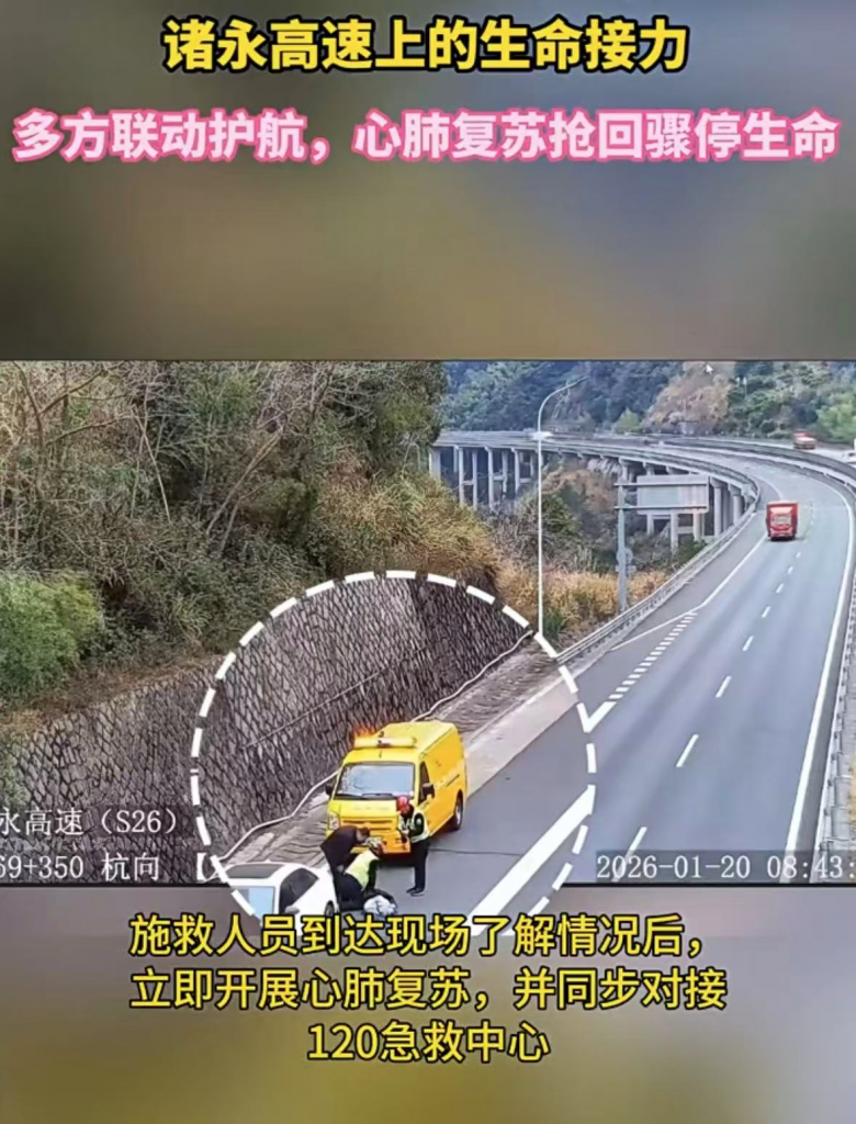 46岁的关女士来自苍南,前段时间心脏不舒服,在杭州一家省级医院被诊断为冠心病,进行药物治疗。1月20日早上6时多,关女士在家突发胸痛伴晕厥,家属赶紧呼叫了当地120。但没多久,关女士就缓过来了,就让120救护人员回去了。考虑到在杭州有就诊记录,家属马上开车带她去杭州。孰料,在转诊途中,关女士的病情突然恶化。当天早上8时30分左右,家属开车至诸永高速永嘉段她再次出现胸痛,继而心跳骤停,意识丧失,一场跨越县域的紧急救援随即展开。
