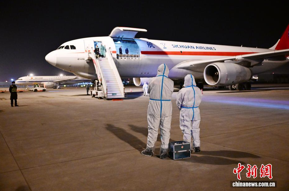 北京时间1月28日1时,中国旅居日本东京都恩赐上野动物园的大熊猫“晓晓”“蕾蕾”平安飞抵成都天府国际机场,随后于6时,顺利入住中国大熊猫保护研究中心雅安基地,接受隔离检疫。图为工作人员检查大熊猫“晓晓”状况。李传有 摄
