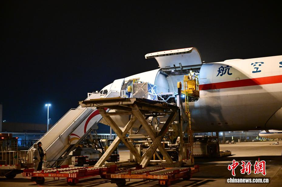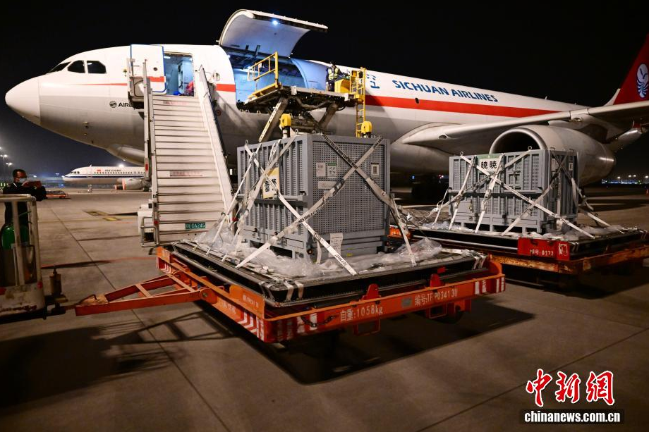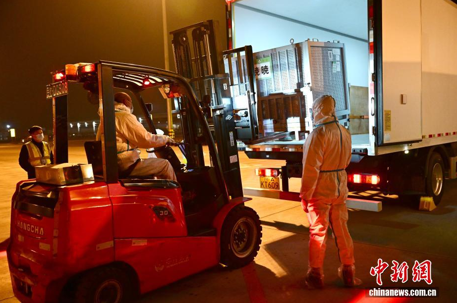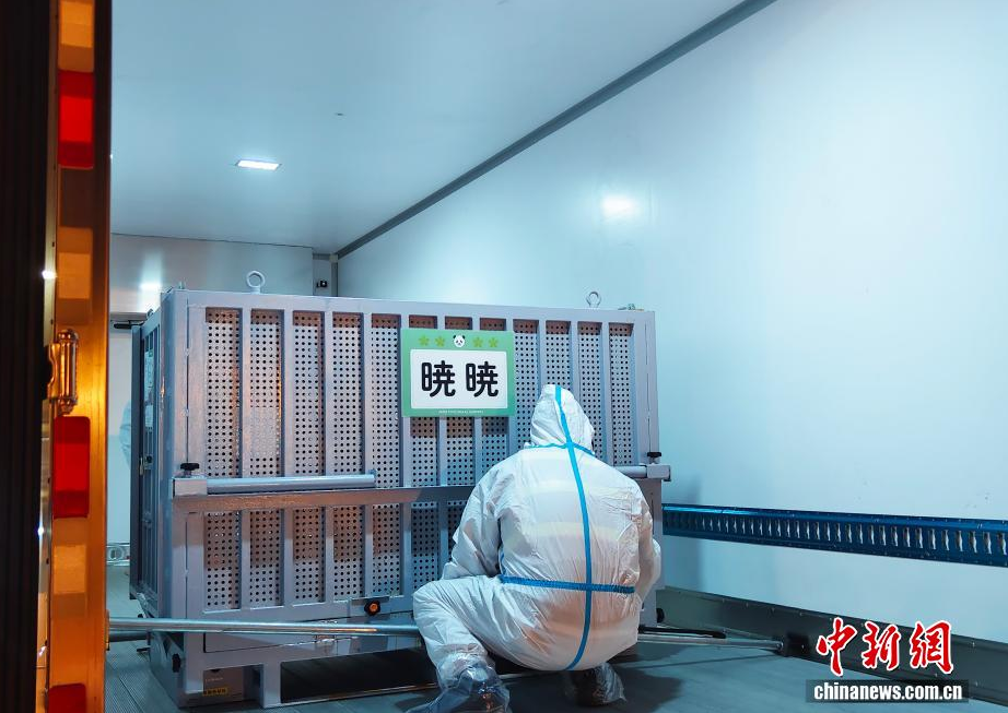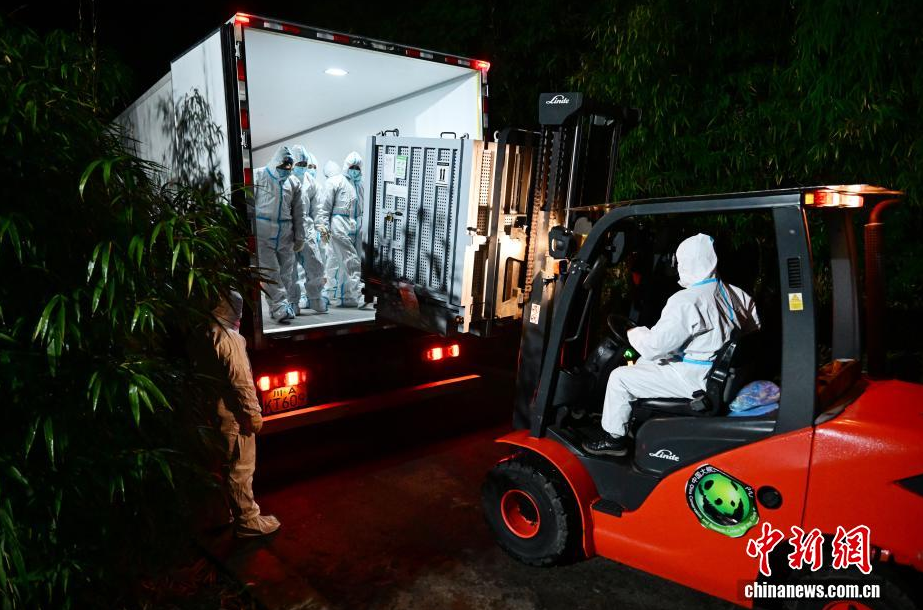 北京时间1月28日1时,中国旅居日本东京都恩赐上野动物园的大熊猫“晓晓”“蕾蕾”平安飞抵成都天府国际机场,随后于6时,顺利入住中国大熊猫保护研究中心雅安基地,接受隔离检疫。图为旅日大熊猫“晓晓”“蕾蕾”装运上车。李传有 摄
