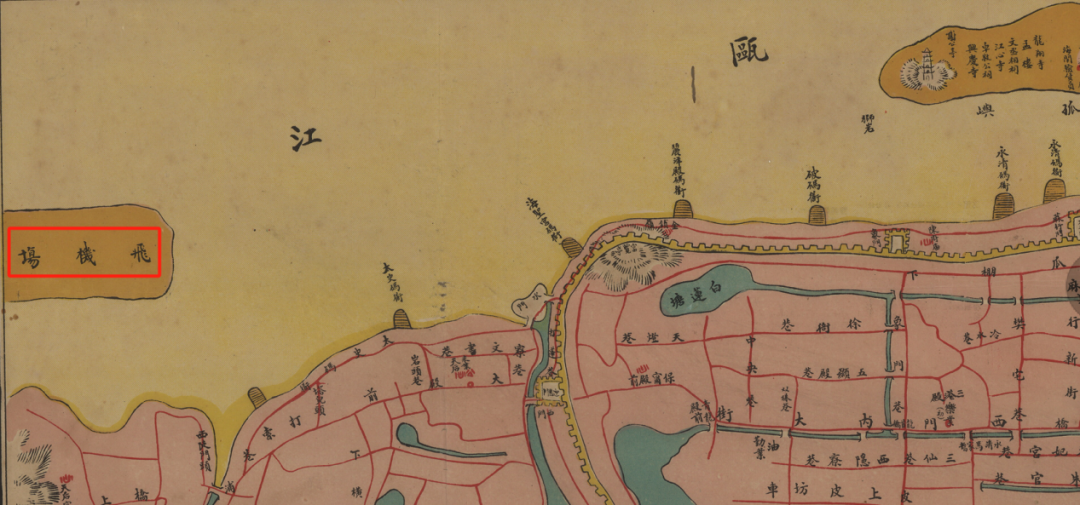 《永嘉县城区全图》左上角,瓯江中的飞机场清晰可见,1933年1月黄聘珍制作,黄瑞庚先生收藏。
