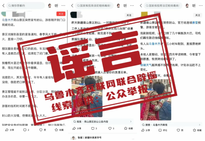 近日,有部分网民在互联网平台发布“乌鲁木齐县南山景区突然封山连续暴雪预警,游客全被劝返”相关帖文,引发关注,严重扰乱公共秩序,造成不良社会影响。