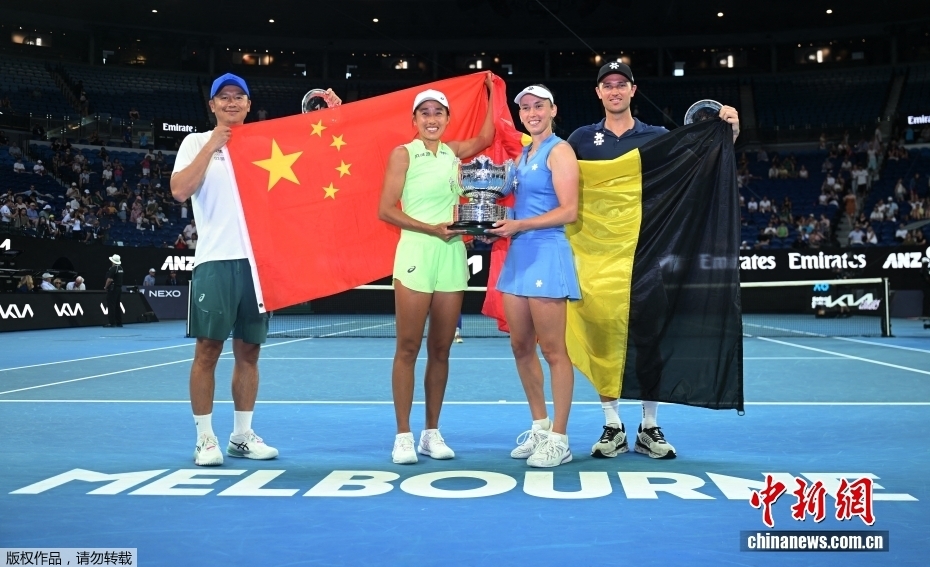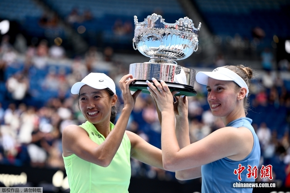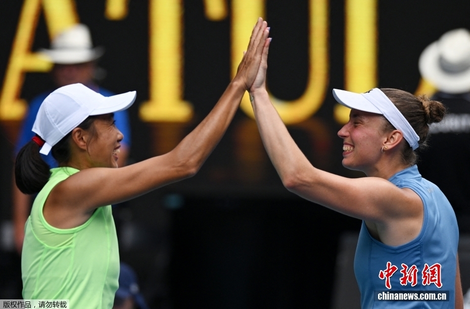 1月31日,2026澳网女双决赛,张帅/梅尔滕斯组合战胜达尼丽娜/克鲁尼奇夺得冠军。这是张帅/梅尔滕斯首次搭档获得大满贯女双冠军,也是张帅个人的第三个大满贯女双冠军头衔。图为张帅和梅尔滕斯在赢得女双决赛后庆祝胜利。