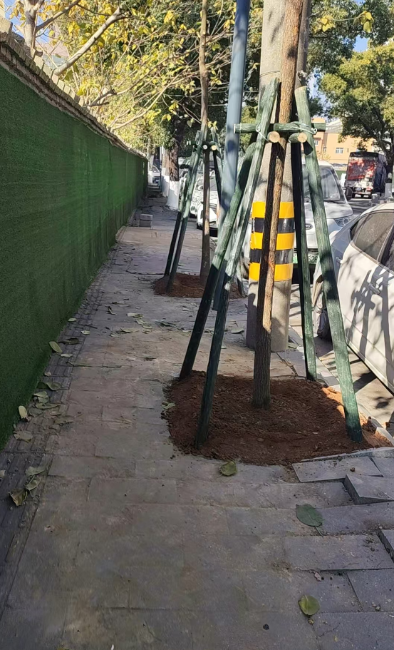 为尽快恢复绿化,园林绿化工人用铁镐破除十余厘米厚的水泥层,清理树穴,重填优质黄泥,改善根系环境。随后,园林工人栽种了适应本地气候的树苗,做好固定、浇水等养护。目前新苗已初步成活,长势良好。