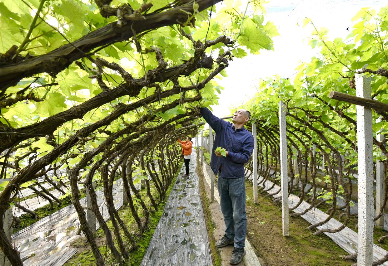 2026年2月4日,河北省唐山海港经济开发区王滩镇的农民在管护大棚葡萄。新华社记者 杨世尧 摄