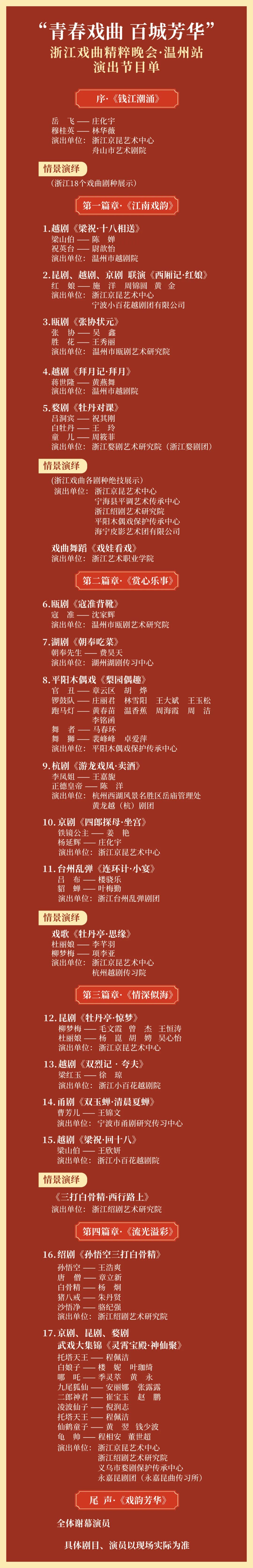温州巡演专场在完整保留全省戏曲明星阵容及优质作品、彰显浙江舞台艺术最高水准的基础上,融入瓯剧、永嘉昆剧、平阳木偶等温州地方剧种,全面展示浙江戏曲的发展成果,彰显传承创新的时代活力。