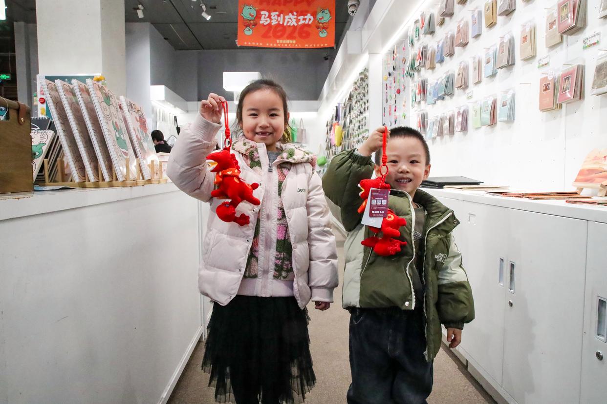 身上装饰着金色元宝的马年限定毛绒玩偶、身着牛仔服的西部马仔毛绒玩偶、手捧金元宝的马财神招财摆件……走进甘肃省博物馆艺术生活馆,各色以马为主题的文创产品吸引着游客驻足。