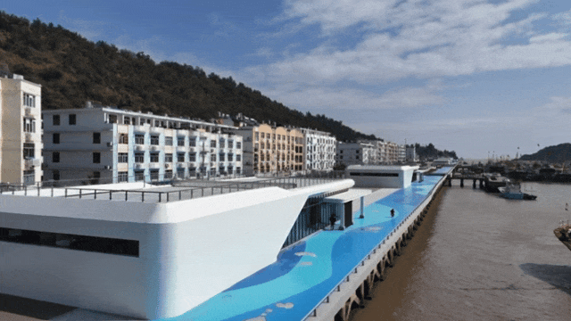 该项目同步实施近3000平方米生态绿化带与1.59公里滨海绿道,设置观海平台、休憩驿站等景观节点,将硬质堤岸转化为“可游可赏可憩”的生态廊道。空间布局上,海塘内侧设置水产与体育用品商店、露天茶吧,外立面则打造体育文化展示墙,并配套建设快艇码头等设施,进一步丰富滨海休闲体验,形成可漫步、可游览、可休憩的开放空间。