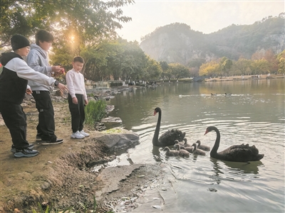 杨府山公园与黑天鹅的缘分始于2014年。当时公园与温州动物园合作,首次引入黑天鹅、鸳鸯、绿头鸭等水禽,成为温州市区首家寄养黑天鹅等水禽类动物的公园。多年来,在良好的生态环境与精心的养护下,园内的“水禽家族”不断繁衍壮大。如今,奥水湖已成为70多位“水禽居民”的和谐家园:漂亮的黑天鹅、成群的大雁、活泼的绿头鸭与赤麻鸭,还有自在栖息的