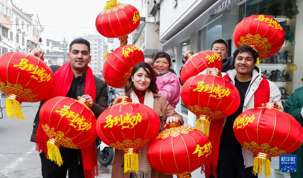 2月10日是北方小年,各地春节氛围日益浓厚。图为2月10日,在江苏省淮安市淮阴区营中社区,淮阴师范学院留学生和社区居民一起挂灯笼。新华社发(赵启瑞摄)