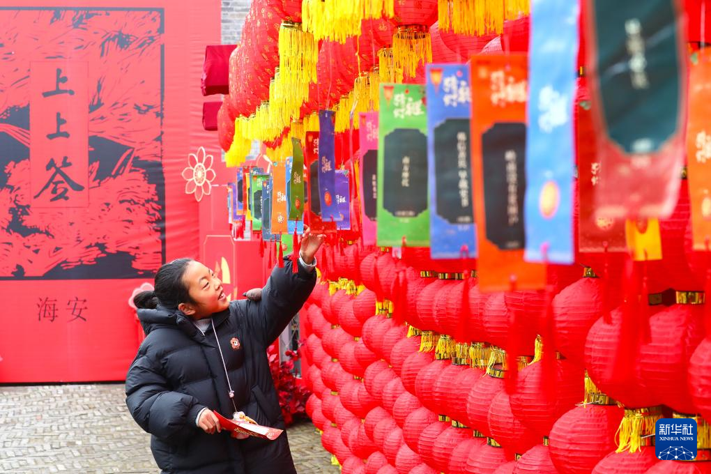 2月10日,小朋友在江苏省海安市博物馆(韩公馆)猜灯谜。新华社发(顾彬斌摄)