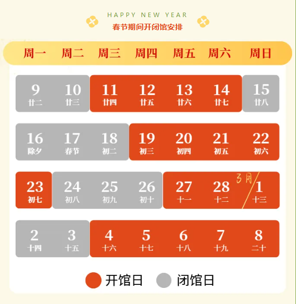 最后附上开闭馆攻略,2月15日(腊月廿八)至18日(正月初二)闭馆,2月19日(正月初三)至23日(正月初七)9:00—16:30开馆(16点停止进场),每日开放4500个预约名额,2月24日(正月初八)至2月26日(正月初十)以及3月2日(正月十四)至3月3日(正月十五)闭馆,3月4日(正月十六)起恢复正常开闭馆。记得提前预约,带上家人赴一场马年科技新春之约吧!