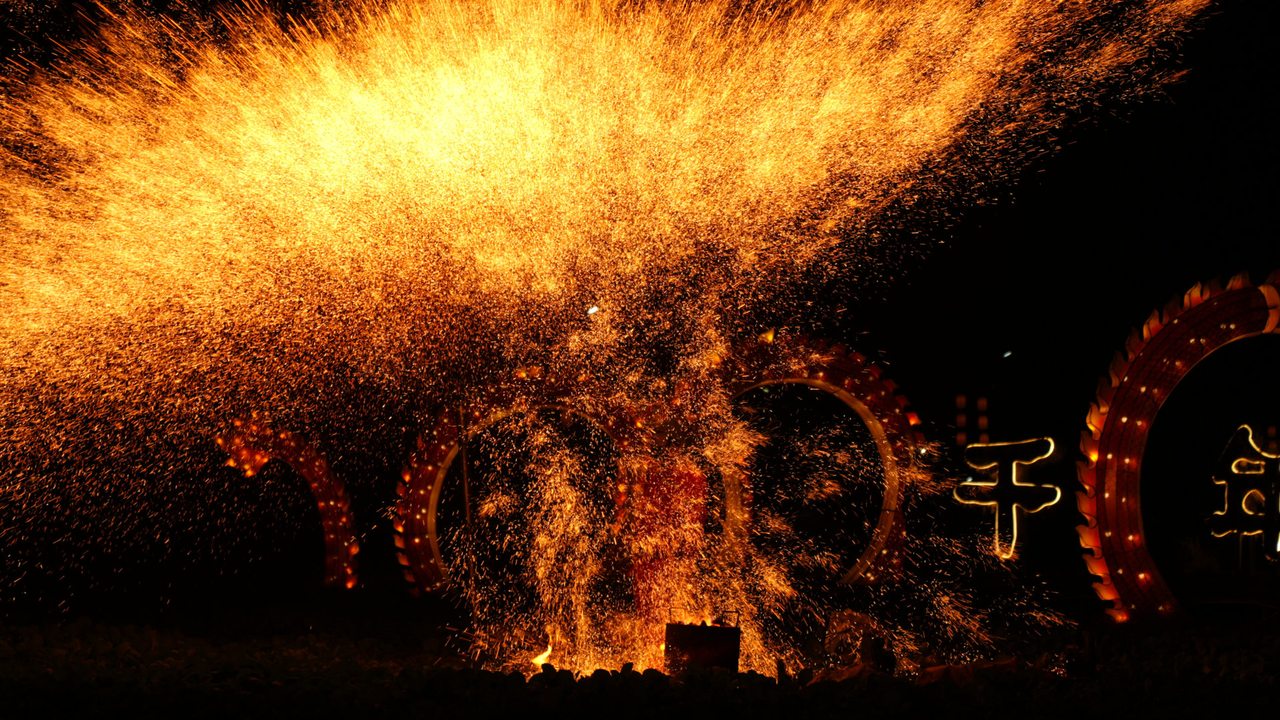 紧接着,最令人期待的非遗打铁花震撼登场,成为当晚最耀眼的亮点。伴随着匠人们的吆喝声,1600℃的滚烫铁水被奋力击向夜空,刹那间,滚烫的铁水化作漫天金花,如流星坠落、似烟火绽放,璀璨夺目,与“龙舞驿途”龙灯栈道交相辉映,灯光与金花交织,营造出如梦如幻的奇妙氛围。这一传承千年的民间绝技,让留学生们充满了好奇与惊叹,绝大多数人都是第一次见到如此震撼的场景,全程瞪大眼睛、满脸兴奋,不时发出阵阵惊呼,纷纷拿出手机记录下这震撼人心的瞬间,定格中国非遗的独特魅力。