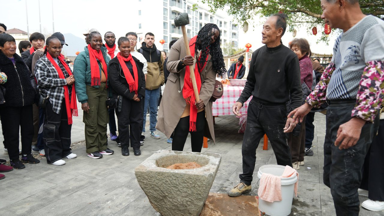 “这才是最地道的中国年味!”2月11日,南方小年的喜庆氛围浸润着温州市鹿城区山福镇驿头驿阳村,红灯笼缀满街巷、锣鼓声隐约可闻,105名来自20多个国家的留学生循着年味而来,与当地村民围坐品荸荠宴、驻足赏非遗秀、携手玩民俗游戏,同台演绎热闹村晚,欢声笑语漫溢古村街巷,让这座沉淀千年的华侨村,多了几分别样的“国际范儿”。