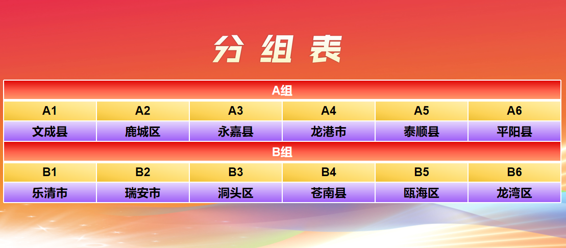在此前的抽签仪式上,我市12个县(市、区)分为A、B两个小组,每个小组各6支队伍,抽签结果为文成县、鹿城区、永嘉县、龙港市、泰顺县和平阳县分在A组,乐清市、瑞安市、洞头区、苍南县、瓯海区和龙湾区分在B组。