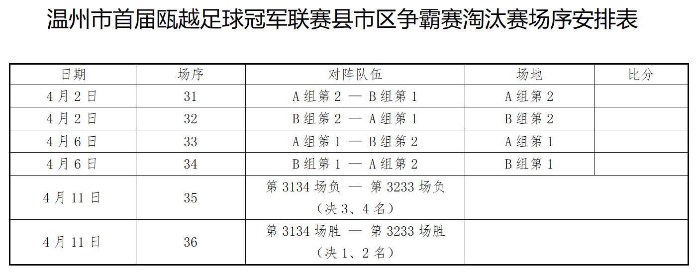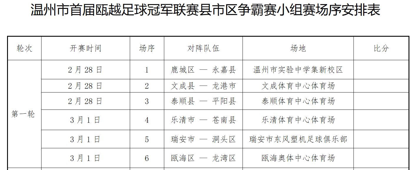 2月13日,温州市首届瓯越足球冠军联赛(简称“瓯冠”)县(市、区)争霸赛赛程表正式出炉,比赛将于2月28日打响,4月11日决出冠军!
