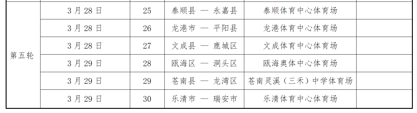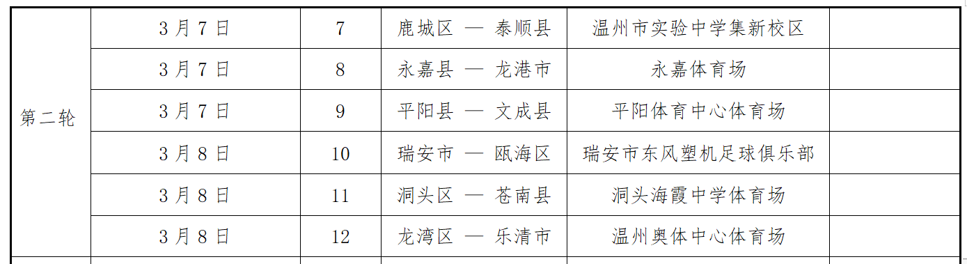 根据赛程安排,首轮比赛,A组三场比赛将于2月28日开踢,鹿城队、文成队和泰顺队率先在主场亮相,分别是鹿城队主场迎战永嘉队,文成队主场迎战龙港队,泰顺队主场对阵平阳队;B组首轮三场比赛将于3月1日进行,乐清队主场迎战苍南队,瑞安队主场对阵洞头队,瓯海队主场对阵龙湾队,具体开球时间未定。