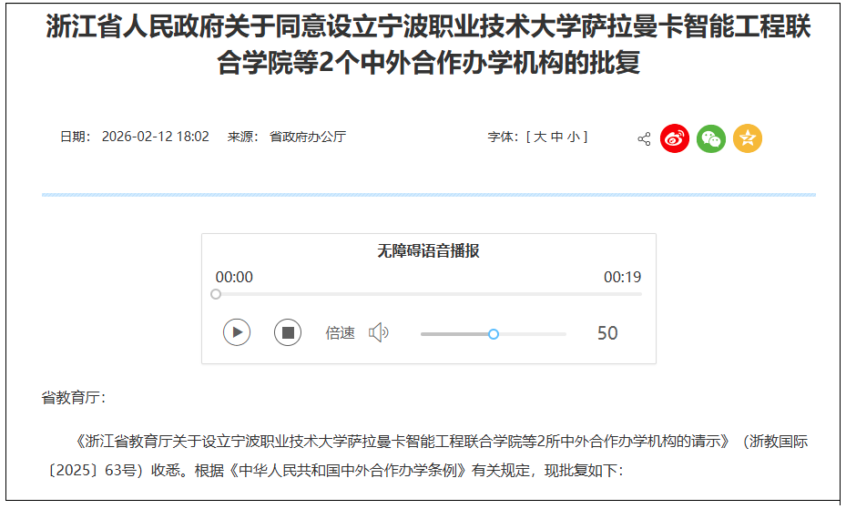 2月12日,浙江省政府官网发布《浙江省人民政府关于同意设立宁波职业技术大学萨拉曼卡智能工程联合学院等2个中外合作办学机构的批复》。批复称,同意设立宁波职业技术大学萨拉曼卡智能工程联合学院(以下简称宁职联合学院)和温州职业技术学院尼亚加拉工程技术联合学院(以下简称温职联合学院)。