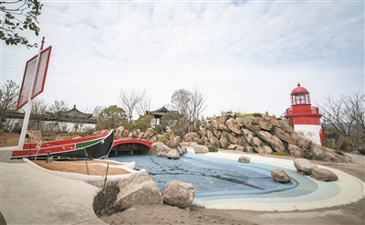 舟山园主打海洋风情,入园即见一艘红黑绿三色的“绿眉毛”传统帆船,船头昂首,直指远处叠石而成的“海岛”。船岛之间,心形海湾与半月沙滩铺展相连。岛礁后方,红白两色的花鸟灯塔静静伫立,这座复刻自嵊泗,被誉为“远东第一灯塔”的地标,与西侧寓意跨海大桥的红桥遥遥相望。