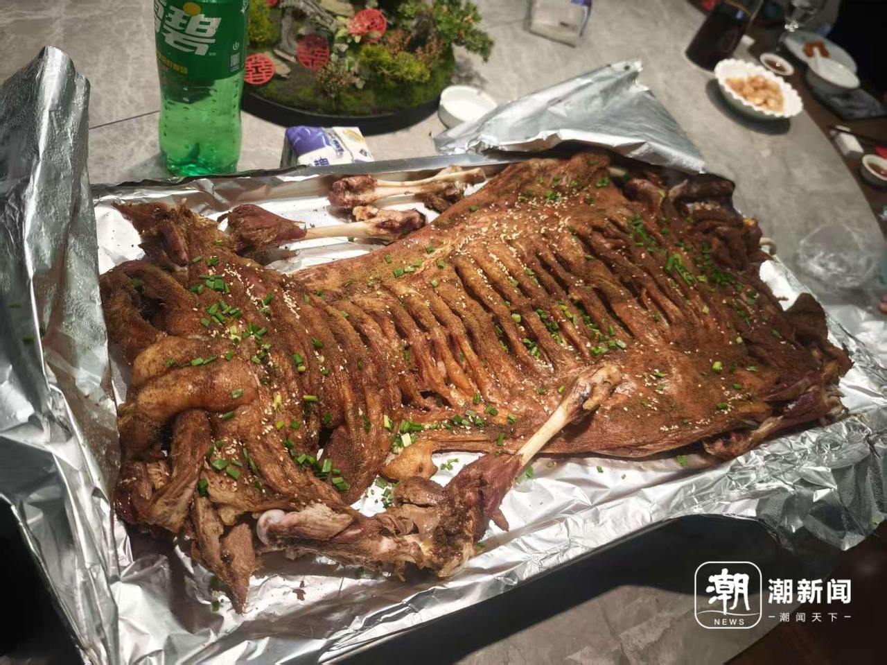 年夜饭餐桌上的“烤全羊”。记者 许峰 摄