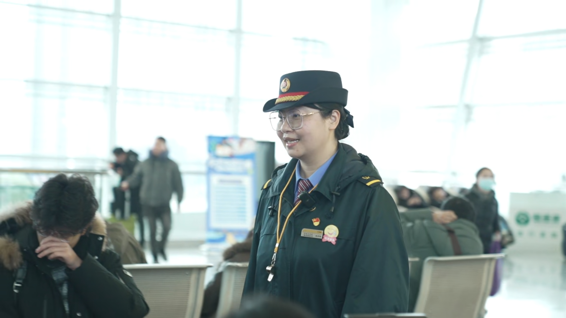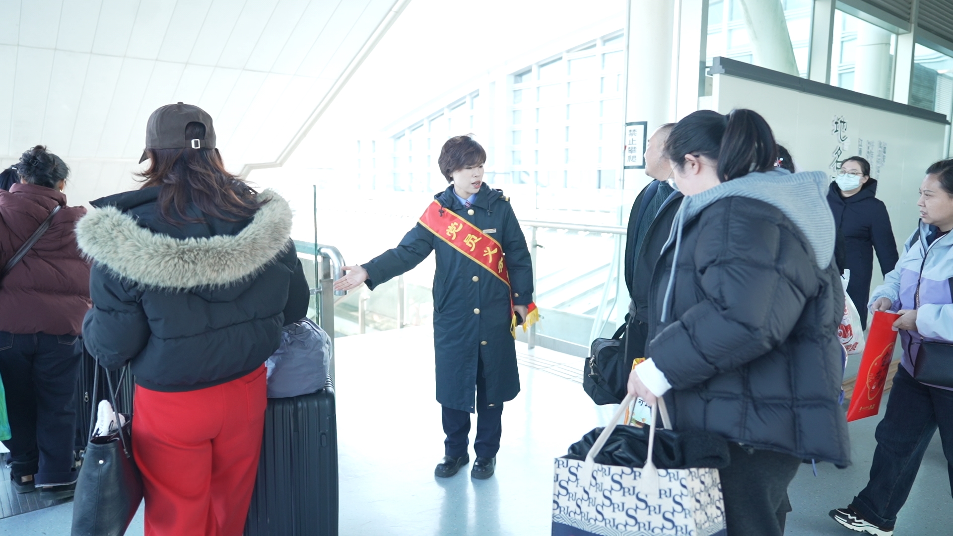 记者初次见到姜若梅,是在车站的候车大厅,往来穿梭的人群中,她的身影格外醒目,她手持对讲机,脚步匆匆,正与同事沟通协调。这位爱笑的山东姑娘,眼睛微肿,与她交谈后才了解到,她前一晚护送一位乘客就医,已经一宿没合眼了。