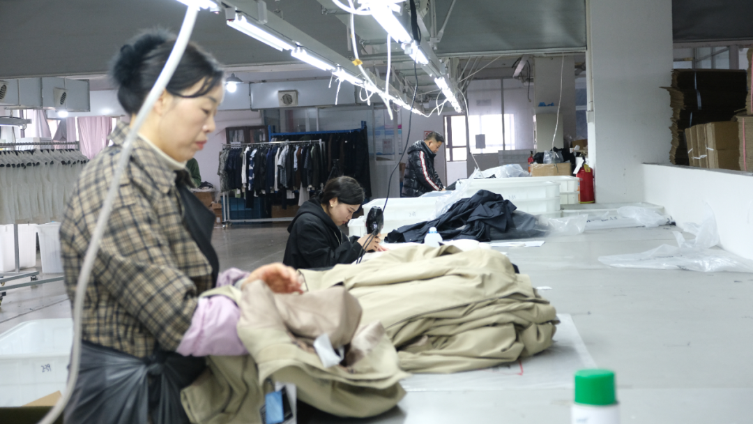 像王丹这样“在路上”的状态并非个例。进入年底,企业多个业务团队的出差频率明显增加,从南到北,从合作品牌方到第三方工厂,既要为春夏订单落实产能,也在同步推动秋冬新品的开发与打样。生产一线同样是一派繁忙景象,在待检区、吊挂检验区、检验区,一件件成衣有序流转,工人们不放过衣服的任何一处细节,确保每件产品都以完美姿态投入市场。