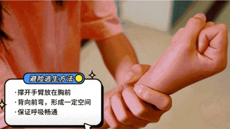 可用一只手握住另一只手的手腕,撑开手臂放在胸前,形成牢固而稳定的三角保护区姿势,保证呼吸顺畅。沿人流行进的同时寻找最近的安全出口或者合适的躲避场所。