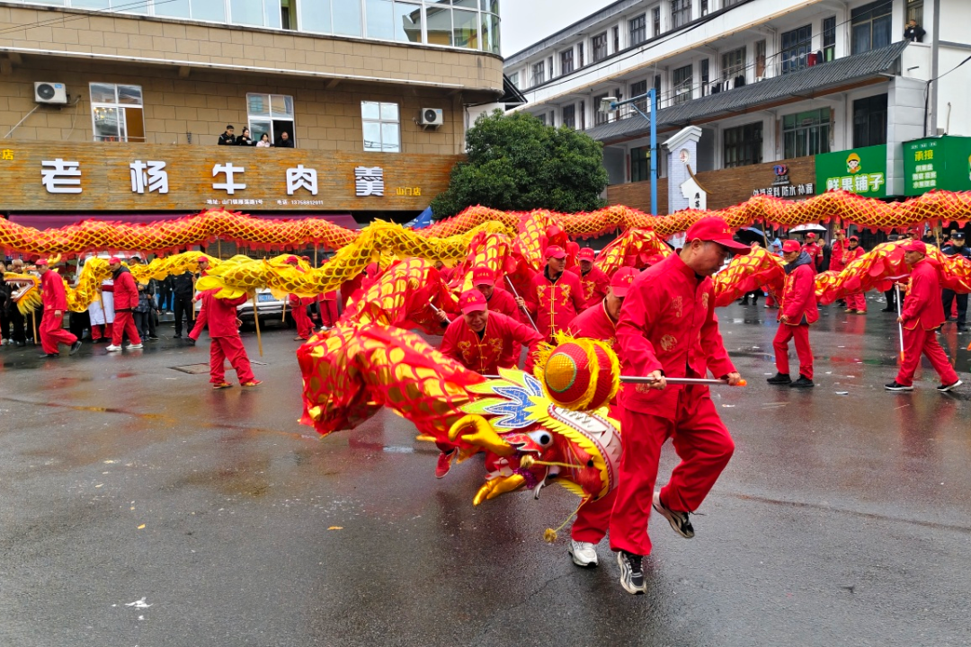 一大早,腾蛟镇驷马村的菜花龙队伍从该镇中心的“车路头”浩荡出发。这条由传统匠心扎制的祥龙,在舞龙队员行云流水的配合下,时而昂首腾跃欲上青云,时而盘桓穿行于青石板路。龙首频频颔首,向沿街人家传递新春的吉兆;商户门前彩灯高悬,映照着游客追逐龙影的笑脸。一时间,锣鼓声、欢笑声、快门声交织在一起,古老的腾蛟镇在龙舞的韵律中焕发出勃勃生机。