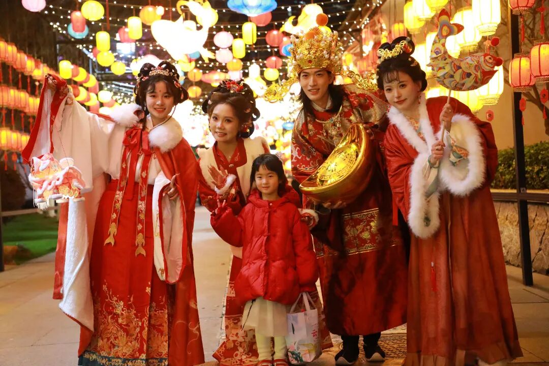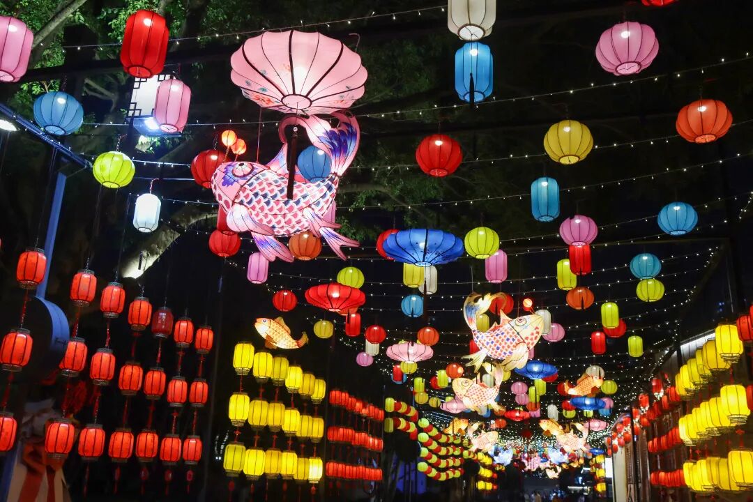 戏韵不止于高台。九山湖上,一艘锦绣花船正荡开碧波,船头古筝的清越琴音与潋滟水光相和,引得游人纷纷举起手机,定格这“碧波琴韵绕九山”的诗意瞬间。而当目光从湖面收回,主戏台后方的石板小径上空,早已悬起一片璀璨“灯海天幕”,以千盏明灯织就的流光溢彩,让抬头仰望的市民游客随手一拍即成大片。