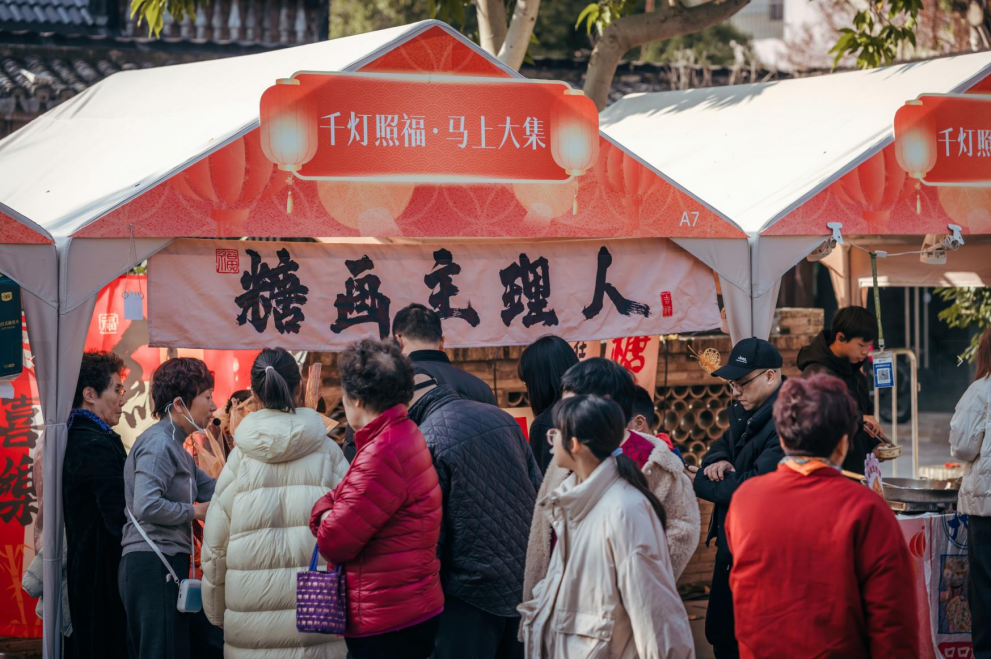 如何引客流、聚人气、促消费?在多元打卡活动之外,九山书会还推出了一场“马上大集”,汇聚了非遗手作、地道年货、风味美食等多元摊位,将节日的热闹与新春的消费一并点燃。