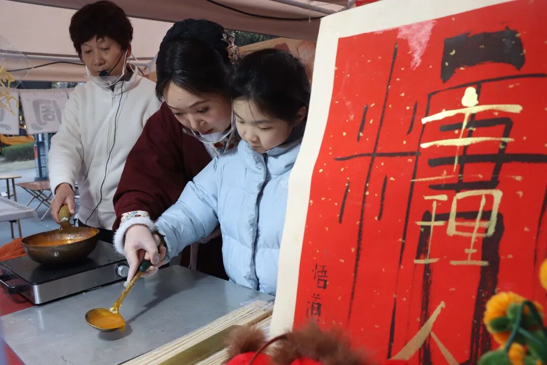 穿梭于熙攘的摊位间,“马”元素无疑是最亮眼的“高频词”。在糖画摊前,主理人何姝在骏马糖画的造型设计上融入了巧思,以繁体字“馬”为基底,下面的四点水换成了“2026”字样,马背上驮着一个金元宝,寓意“马上有钱”。为了契合新春氛围,何姝将自己的摊位也设计一新,马年玩偶错落点缀其间,她自己则换上了一袭喜庆的汉服,并推出了手把手教学的体验环节,将这口甜种进孩子们的心里。