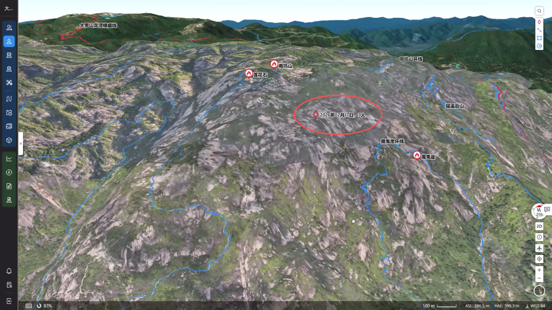 17时40分许,特警救援队员到双岙水库,同赶来的消防救援人员进行了简短研判。大罗山双岙水库西侧分布着魔鬼崖、莲花石等奇峰异石,山势险峻,造型独特,时有游客前往观景打卡,且多为未开发区域,极易误入野路。根据获取的卫星坐标,救援人员迅速调取大罗山三维建模数据,结合地形特征研判,发现被困位置附近有一条明显的深沟,为空中搜索提供了有利条件,缩小了无人机搜寻范围。