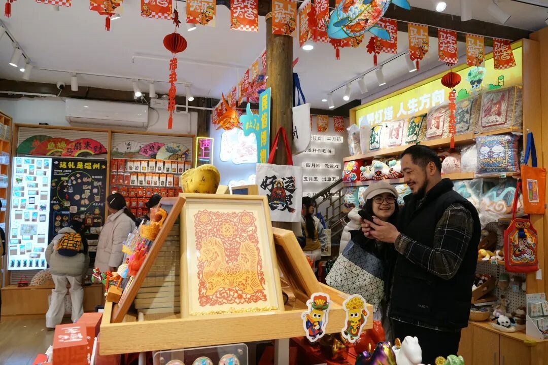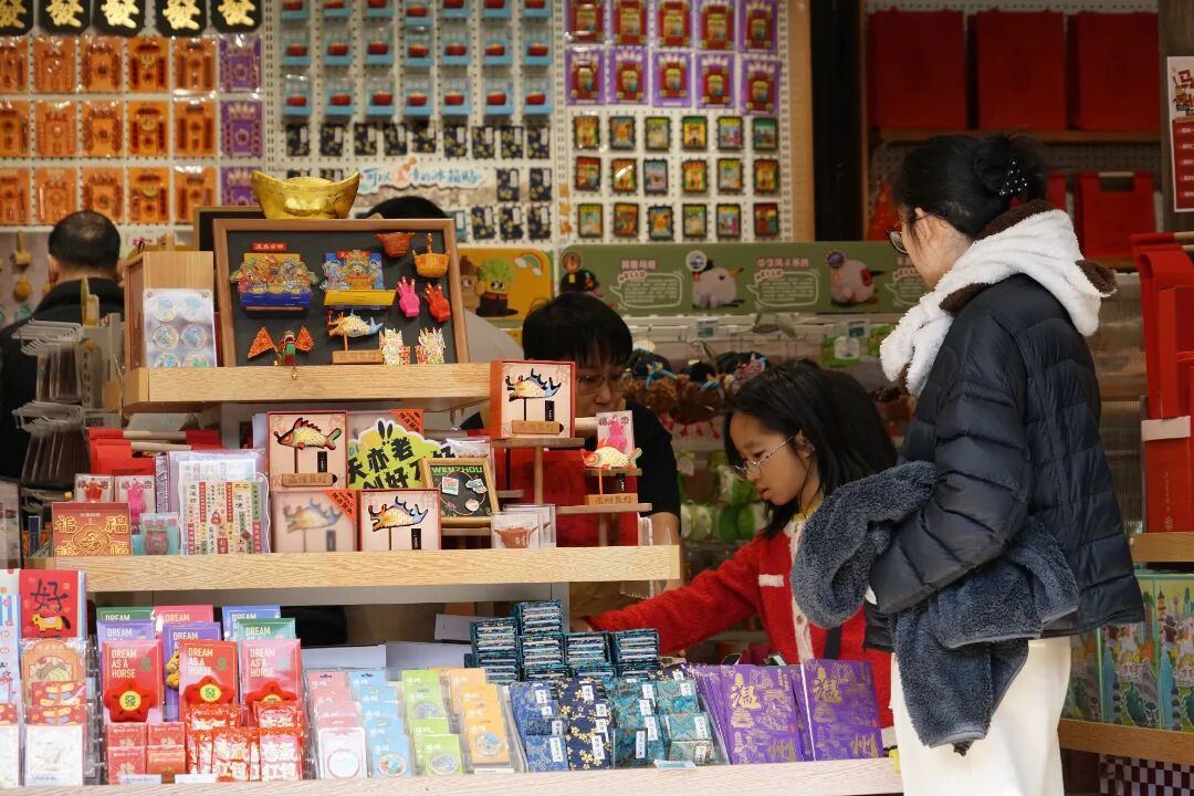 真金白银的优惠也点燃了人们的消费热情。街区在春节期间发放消费券、数币红包,商户也推出联动折扣,给市民送上“惠民大礼包”。实惠的让利活动带火了鞋服、餐饮等传统消费,各类文创产品也成为游客争相购买的“新年伴手礼”。